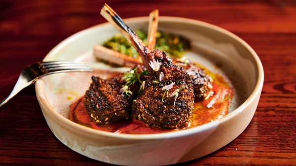 Appetizers like a mezze platter with hummus and grilled local vegetables or the buttermilk fried gator tail set the tone for a playful meal.